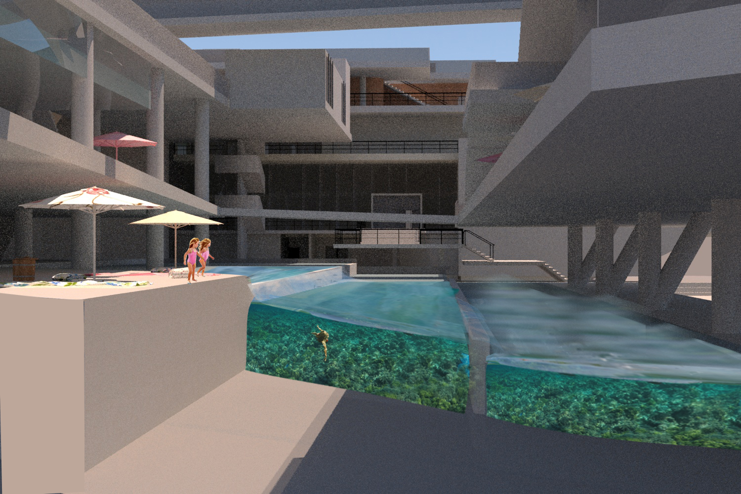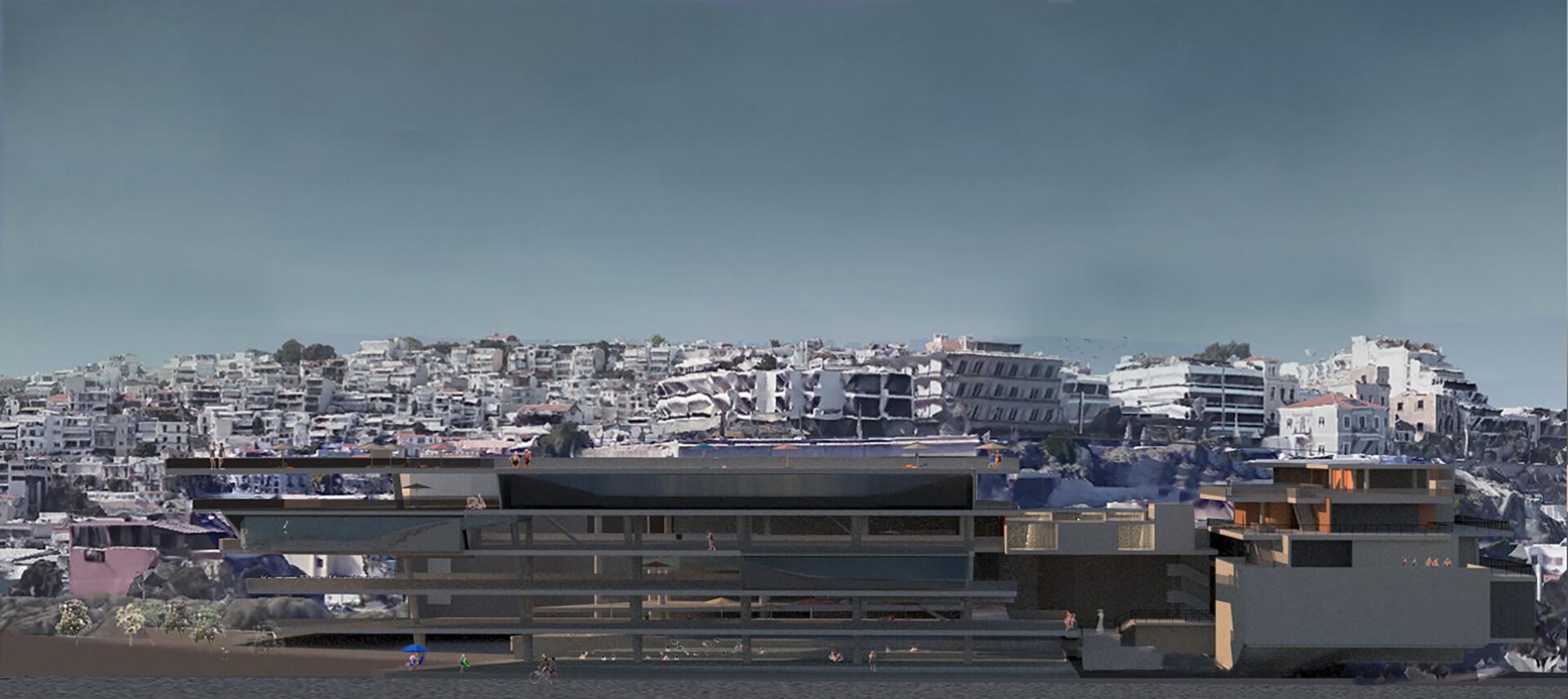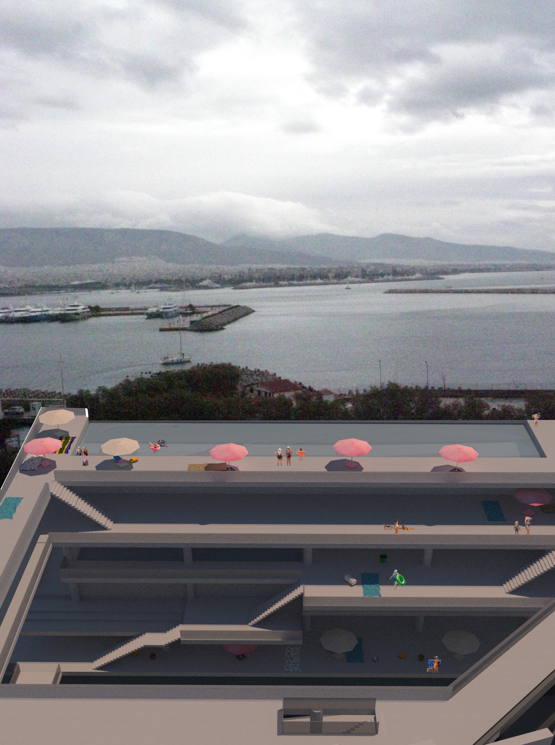 On the foot hills of Kastella, (which is an area o Piraeus, above Mikrolimano) there was an effort to design swimming pools. Seawater pools on various levels, which create a public move from Kastella to Mikrolimano and vice versa. The construction consists of two bars with a gap between them, which on the ground floor, connected with a large sea-water pool, allowing a view of sea scenes either from Kastella or Mikrolimano. From Kastella to the sea one can enjoy scenes from a seaside that does not the coast can be offered at this particular location Pools with pured seawater, umbrellas, coffee shops, cinemas make up this artificial beach. On this beach the visitor uses it, exploits the space as he believes. This gives a sense of freedom that would also give the void of the natural coast. Walking in Mikrolimano and observing the make-up, there are several scenes that you can see on a beach in front of you. The slide from the pools intensifies the extrovert, making the presence of bodies in the area strong.