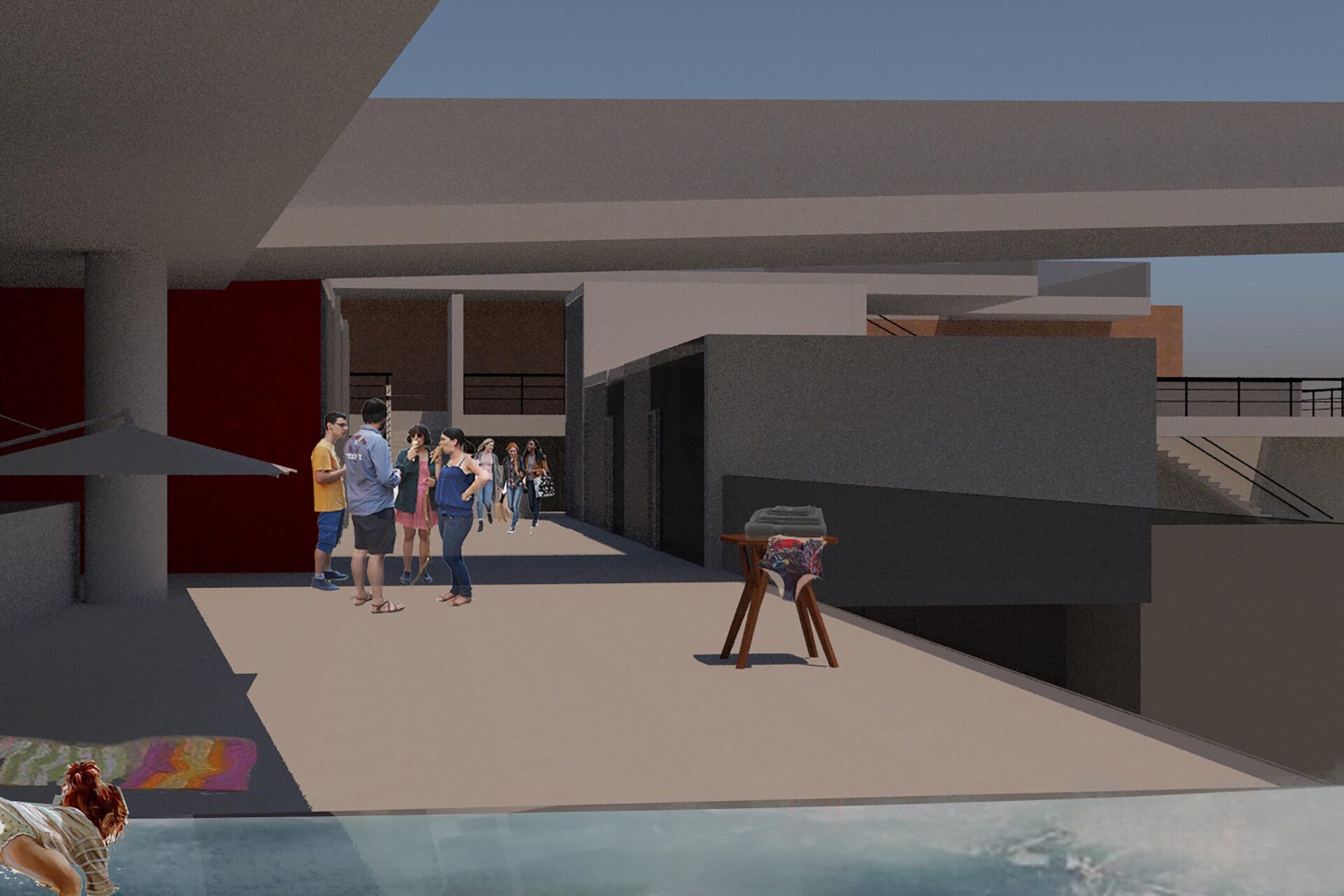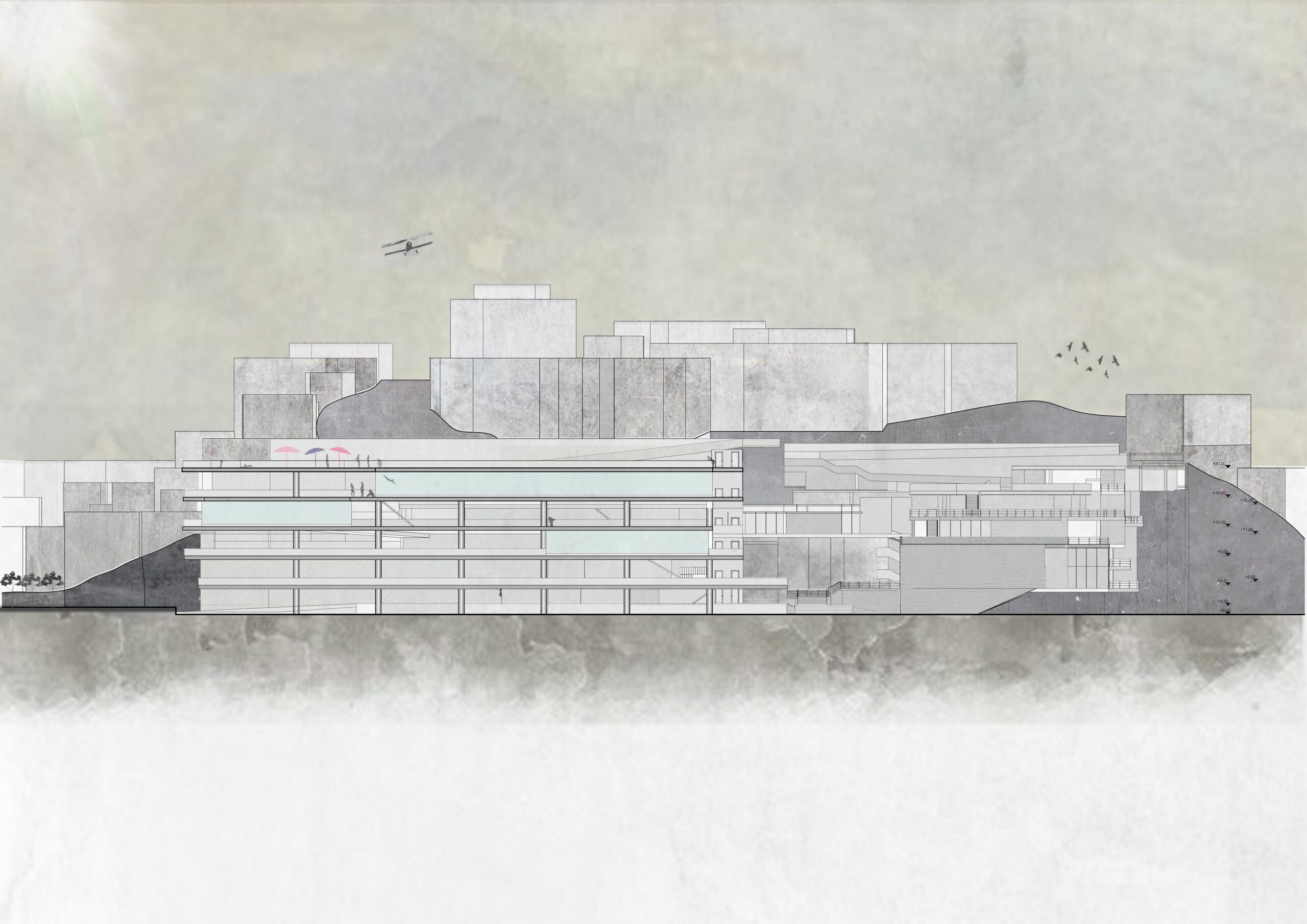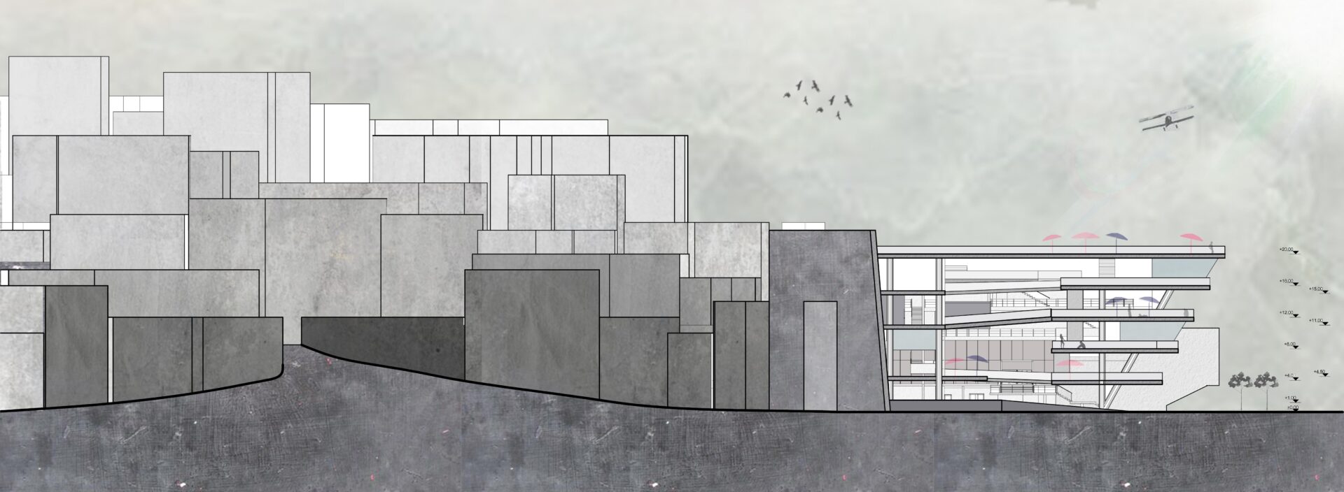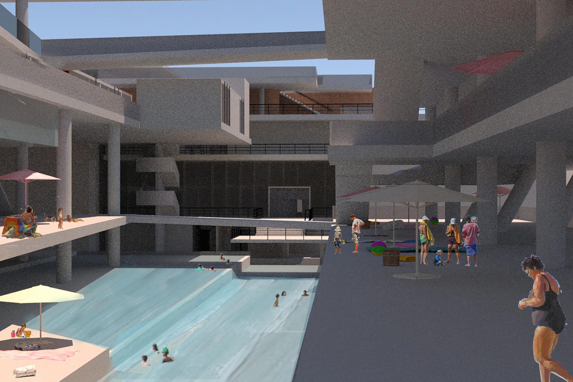 On the foot hills of Kastella, (which is an area o Piraeus, above Mikrolimano) there was an effort to design swimming pools. Seawater pools on various levels, which create a public move from Kastella to Mikrolimano and vice versa. The construction consists of two bars with a gap between them, which on the ground floor, connected with a large sea-water pool, allowing a view of sea scenes either from Kastella or Mikrolimano. From Kastella to the sea one can enjoy scenes from a seaside that does not the coast can be offered at this particular location Pools with pured seawater, umbrellas, coffee shops, cinemas make up this artificial beach. On this beach the visitor uses it, exploits the space as he believes. This gives a sense of freedom that would also give the void of the natural coast. Walking in Mikrolimano and observing the make-up, there are several scenes that you can see on a beach in front of you. The slide from the pools intensifies the extrovert, making the presence of bodies in the area strong.